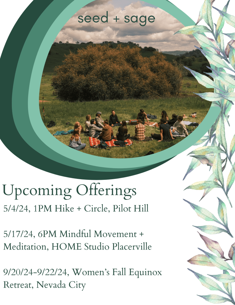 You know what they say—April showers bring May flowers and we expect this year’s wildflowers to be in full bloom for our hike + circle on this coming Saturday, 5/4 at 1PM in Pilot Hill. We’ll be hiking to a beautiful meadow to do some gentle yoga with Carlie, meditate with Olivia, and sing mantra with Eden. Suggested $20 energy exchange (or $30/couple). If you’re interested in joining us, please reach out and we’ll send the details!