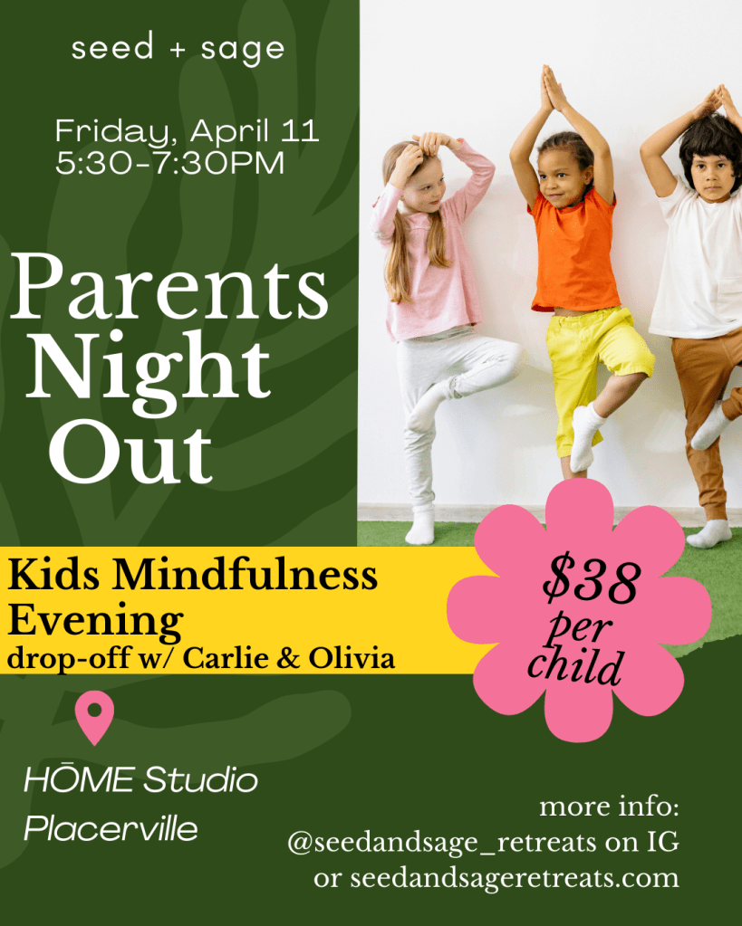 Parents Night Out—Kids Mindfulness Evening, Friday, April 11, 5:30-7:30PM, HŌME Studio Placerville: Drop kids off for yoga, mindfulness circle games, and more! Enjoy dinner or other time away while kids get their own social and self-care night. Best of all, pick them up all ready for bed after their savasana with lavender foot rubs! Both Carlie and Olivia are homeschool moms with experience working with children—Carlie has taught kids yoga and Olivia has been a credentialed K-8 teacher since 2011. And, their kids will be present as “ambassadors” for this fun mindfulness evening. Please send a lunchbox dinner. Additional allergen-friendly snacks will be provided. Ages 6+. Jammies encouraged! We can’t wait! $38/child, sign-up online.