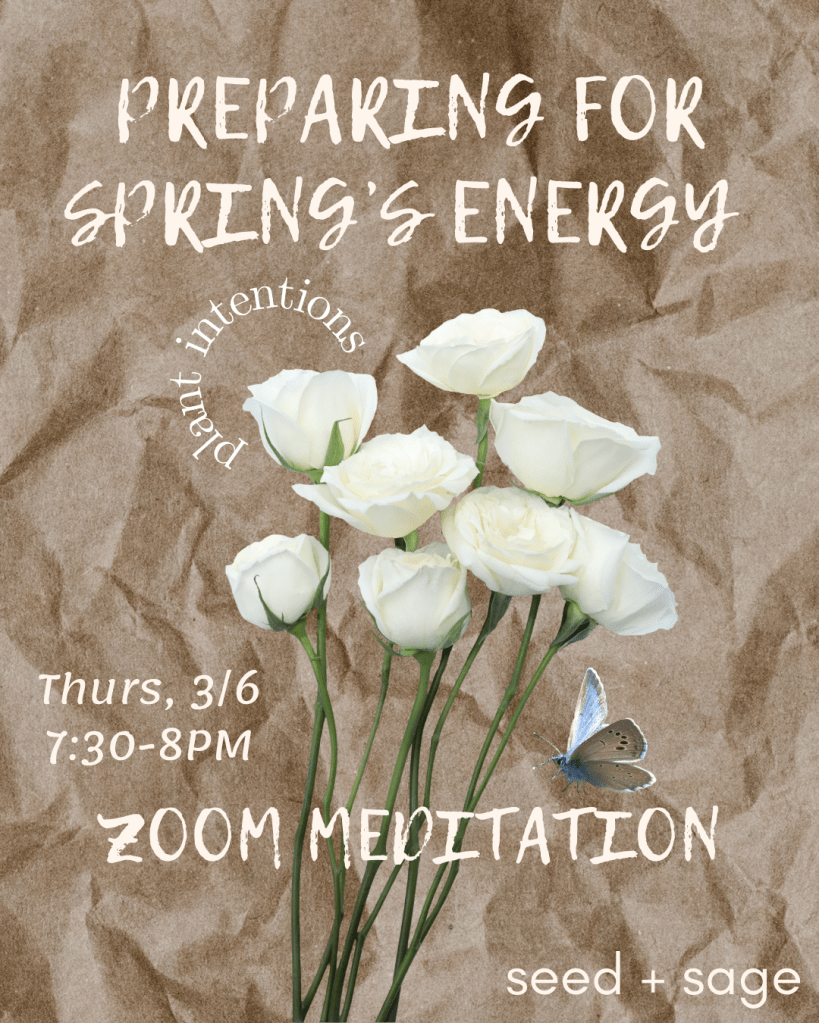 Preparing for Spring’s Energy Zoom Meditation, Thursday, March 6, 7:30-8PM: While we culturally think of the new year as January 1, nature’s new year begins with the spring equinox when the light comes back into balance. It’s the perfect time to tap into Dispenza-inspired techniques to bring your dreams for the future to life. We’ll begin with a brief dive into the quantum physics around creating our realities and then meditate for 15-20 min. All are welcome, reach out for Zoom link. This is a free community offering.