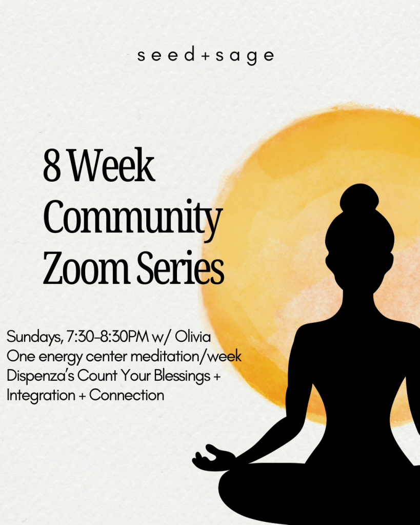 Olivia is offering an 8-week journey through the body’s energy centers using Dr. Joe Dispenza’s Count Your Blessings meditation series, alongside traditional chakra wisdom and insights from Caroline Myss’ Anatomy of the Spirit.